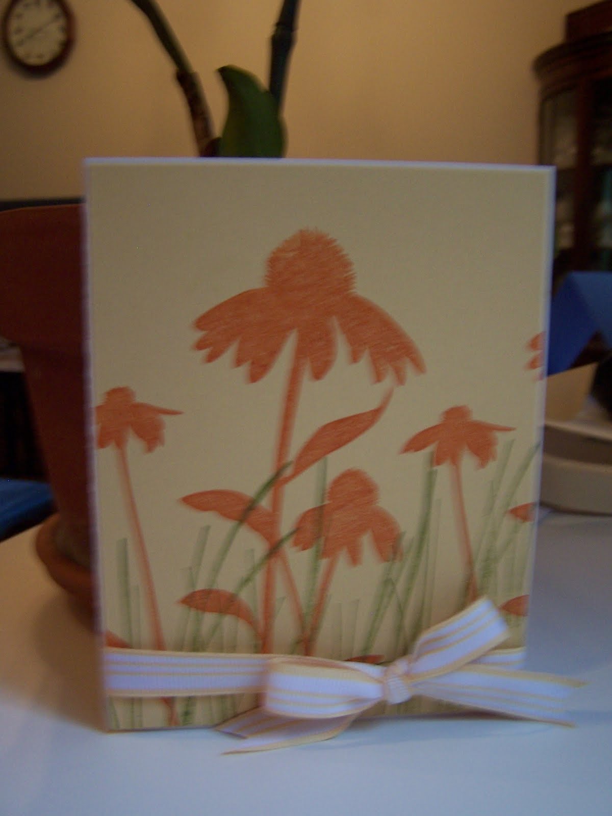 I got my new SU goodies last week and had to play with my new colors. I got the Marina Mist ribbon, so I started with that color on my new Color Coach. It recommended Cajun Craze, also new, and Crumb Cake, formerly known as kraft. I inked up the flower image from Upsy Daisy in CC ink and attempted the rock and roll technique with CC. It didn't come out quite as I'd hoped but I guess it's okay. Layers are cut with my beloved Cricut. I'm warming up to this whole kraft thing, slowly but surely. I'm not sure I'm so crazy about Marina Mist though. It's just not what I was expecting. But I like this card okay. Hope you do too!